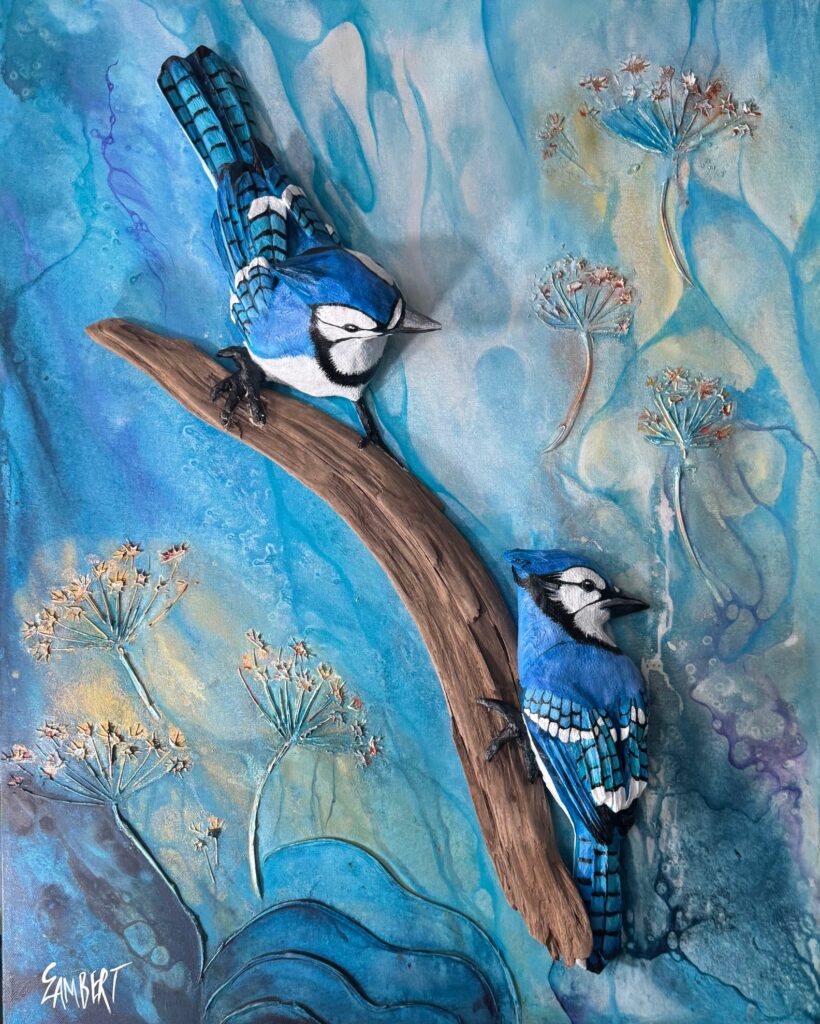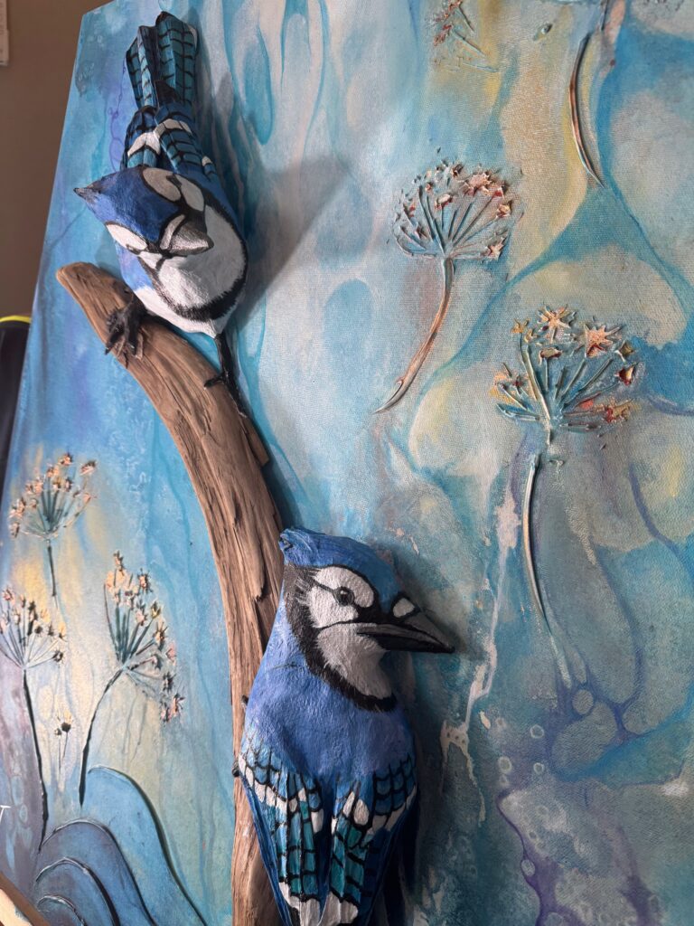 Techniques mixtes: Modelage de papier, acrylique et bois de grève sur toile galerie