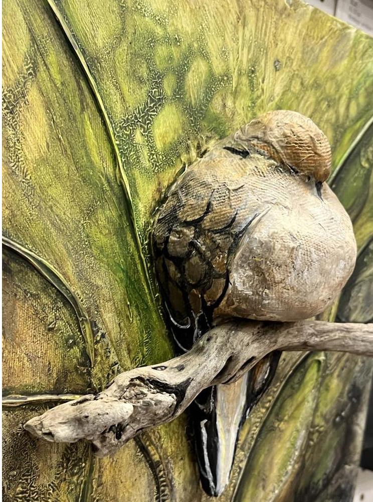 Techniques mixtes: Modelage de papier, acrylique, dessin et bois de grève sur toile galerie